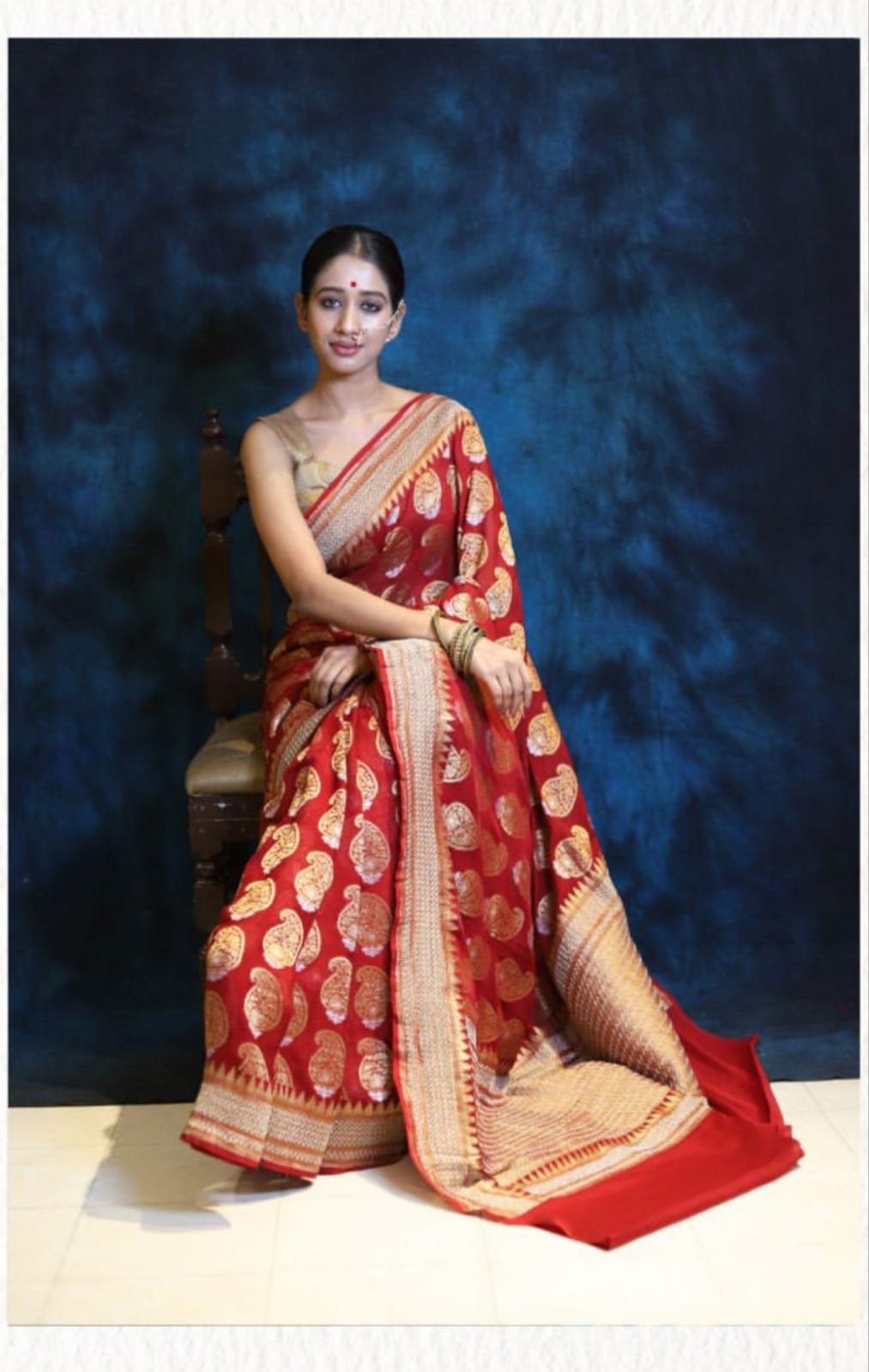 Khadi georgette is highly breathable and easy to carry, allowing you to stay comfortable throughout the day. Its slightly sheer and flowy nature gives it a modern appeal while maintaining a traditional charm.